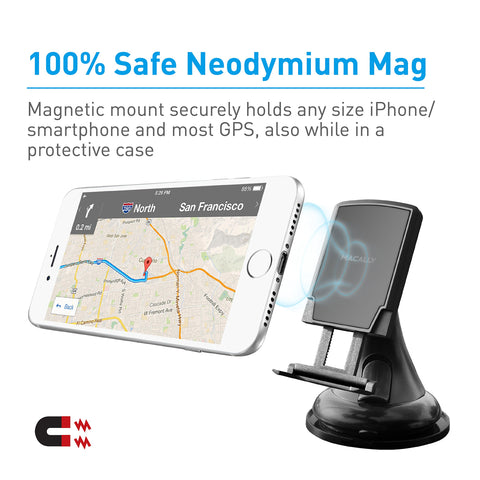 Offer Type:Dashboard & Windshield Macally MGRIPMAG The Macally MGRIPMAG is a magnetic phone mount holder for the dashboard or windshield that allows you to comply with the law to make hands-free phone calls in your car and use your cellphone as a navigator. Secure Hold with 100% Powerful Safe Neodymium Magnet 50% more powerful than standard magnets securely attaches your phone to the mount and allows for easiest attachment and removal. Addition stability is provided with the adjustable “feet.” Secure Mount The mount attaches to the your dash or windscreen glass with a suction cup mount. Also included is a base disc for textured surfaces. Quick One Handed Mounting  Use only one hand to mount your phone or to tilt/ rotate your phone for your perfect viewing position.  Comes with 4 Magnets  Rectangle, Circle, Diamond, and Heart  Device Compatibility  Works any mobile device, smartphones, GPS, or mini tablets with magnets inside or outside of your case from cell phone brands such as Apple, iPhone, Samsung, Google Android LG, Nokia, Huawei, Blackberry, HTC and more. Worry-Free Warranty  At Macally, we believe in our products. That's why we back them all with a one-year warranty and provide friendly, easy-to-reach support for any of your questions.
