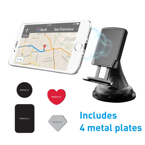 Macally Universal Dashboard / Windshield Magnetic Car Mount Phone Holder for Cell Phones, GPS, & Mini Tablets | 4 Metal Plates Included Circle, Rectangle, Heart, & Diamond (MGRIPMAG)