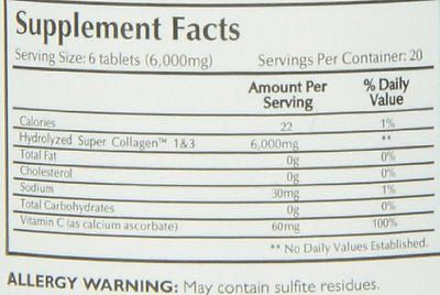 Super Collagen plus c type iandiii tablets : the collagen peptides type 1 and 3 in Super Collagen support collagen in tendons, ligaments, hair, skin, nails, and lean muscle. These two types of collagen are the main types found in connective tissue making up 90% of the body's total collagen content. Super Collagen is rich in hydroxyproline and hydroxylysine, which are two key amino acids specific only to collagen and especially important to collagen production. The benefits of supplementing with Super Collagen are twofold: the body is nourished with collagen 1 and 3 where it is deficient and then Super Collagen acts as a messenger to trigger the synthesis of new collagen fibers. Super Collagen is derived from pharmaceutical food grade bovine collagen that is extracted from the dermal layer. Super Collagen is then enzymatically hydrolyzed, providing a collagen amino acid ration with a low molecular weight for maximum bioavailability. Because Super Collagen genetically parallels the amino acid structure of our own body's collagen, persons taking Super Collagen will experience a 90% absorption rate into the blood stream where cellular changes occur. As a dietary supplement, take three Super Collagen plus ctm tablets twice daily on an empty stomach for maximum absorption.