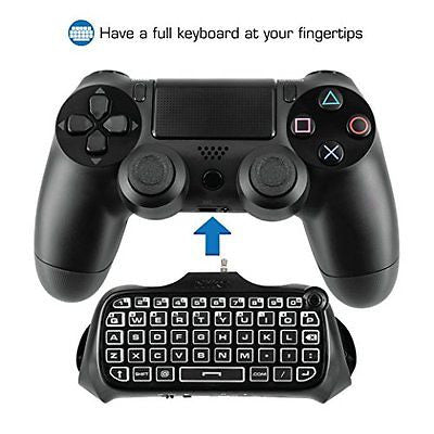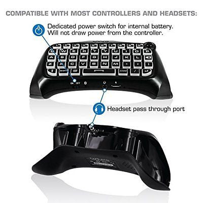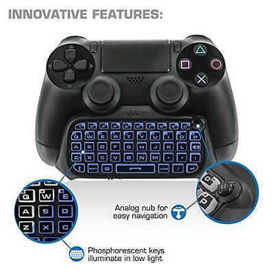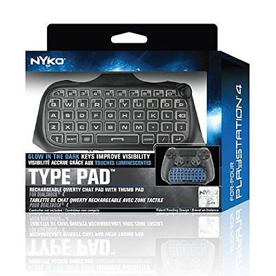 Typing on the PlayStation 4 is made easier with the Type Pad, a full QWERTY keyboard attachment for the DUALSHOCK 4 controller. The Type Pad is a Bluetooth keyboard attachment that pairs wirelessly with the PS4. It is compatible with any game or application that supports Bluetooth keyboards. It's small and compact design fits sleekly with the controller's natural design, allowing for accurate and quick texting with both thumbs during gameplay. A built-in rechargeable battery pack powers the device which can be recharged via any standard micro-USB cable (not included). The Type Pad also features a special analog nub for quick menu navigation as well as dedicated shortcuts for "at" and ".com".