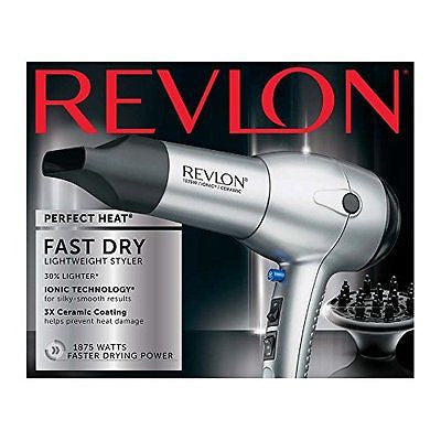 Revlon 1875 Watt Tourmaline Ionic Lightweight Dryer feature Tourmaline Ionic Technology for ultimate shine, volume, and healthier looking styles. This dryer features an ion indicator light, separate heat and speed rocker switches, 2 heat/2 speed settings, cold shot button, hinged endcap, anti-skid bumpers, and concentrator and finger diffuser attachments. This ultra lightweight design is 25% lighter than your average dryer and has a sleek and upscale spray finish. This unit is super quiet and fast drying.